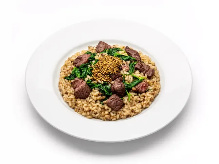 Romige Arborio-rijst met malse runderreepjes, geslonken spinazie en pittige grovekorrelmosterd. Een hartverwarmend Italiaans geïnspireerd comfort gerecht.