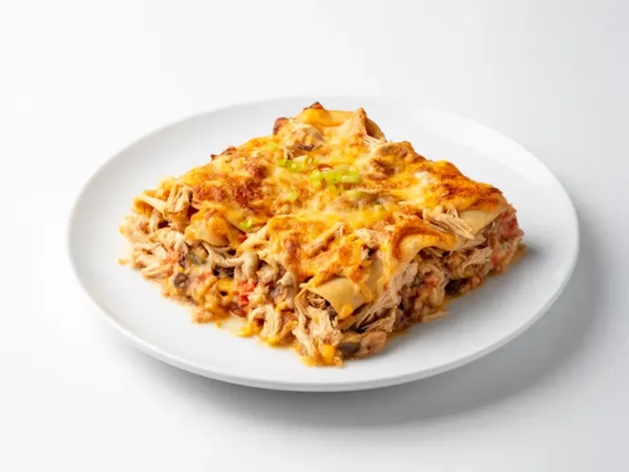 Lagen van maistortilla's, gekruide kip, paprika's en gesmolten kaas in een rokerige rode saus. Tex-Mex comfort eenvoudig gemaakt.