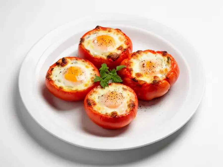 Terwijl je deze sappige tomaten aansnijdt, geniet je van het aroma van kruiden en het warme gebakken ei met kaas. De combinatie is zowel prachtig als heerlijk.