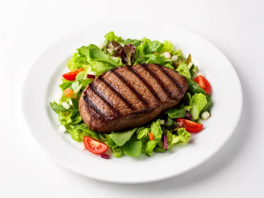 Malse gegrilde ossenhaas over gemengde sla met geitenkaas, cherrytomaatjes en een esdoorn-citroen vinaigrette. Steakhouse elegantie ontmoet gezond eten.