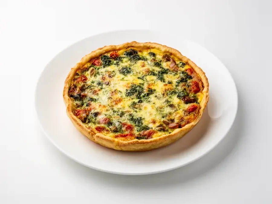Deze elegante quiche vangt de essentie van de Mediterrane keuken. De combinatie van verse tomaten, basilicum en twee kazen creëert een verfijnd smaakprofiel.
