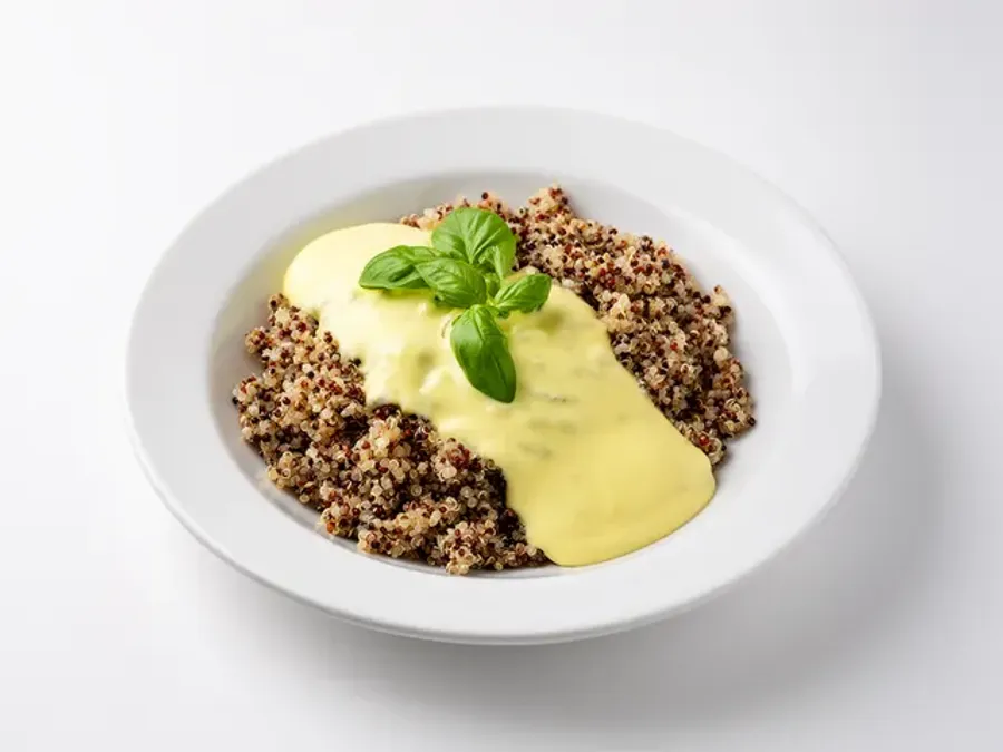 Deze elegante ontbijtbowl verheft quinoa met een luxueuze basilicum hollandaise. De combinatie van eiwitrijke quinoa en romige saus houdt je de hele ochtend verzadigd.