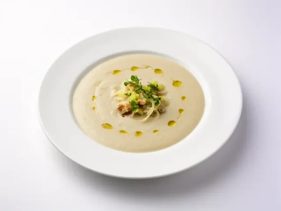 Sopa aveludada e elegante de aipo-rábano terroso, gengibre fresco e um toque de creme. Um conforto sofisticado e suave para o estômago.